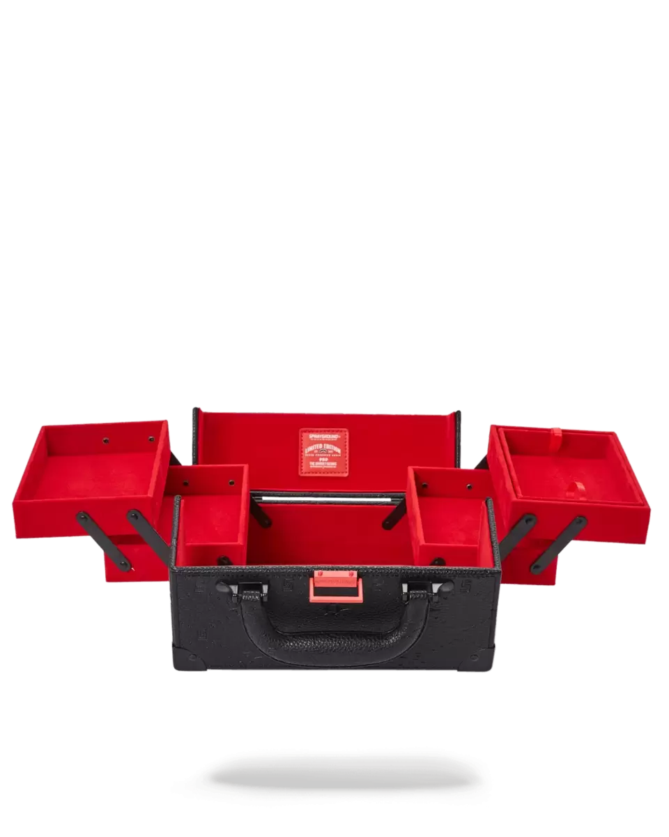 Red velour lining, Tiered shelving, removable tray, interior mirror.