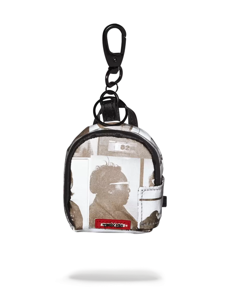3M reflective backpack keychain from LQS x DBD Collaboration for Scammer Collection. Featuring black and white printed mugshots of powerful women convicted for crimes throughout history.