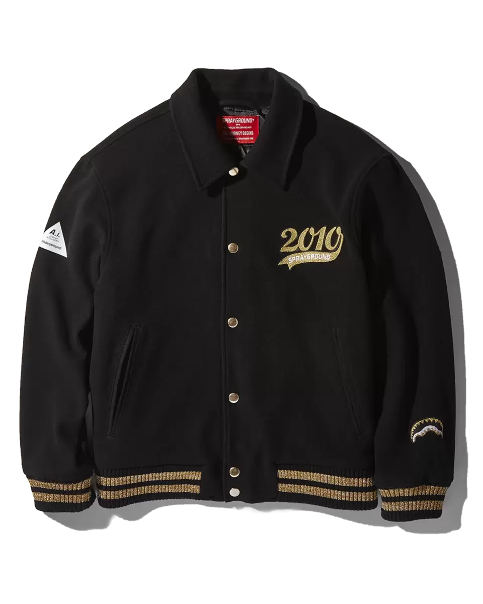 64% Polyester 31% Viscose 5% Lycra Fleece Varsity Jacket Black Embellished with sequins & gold embroidery Sprayground logo on front chest Shirt Collar Snap Fron