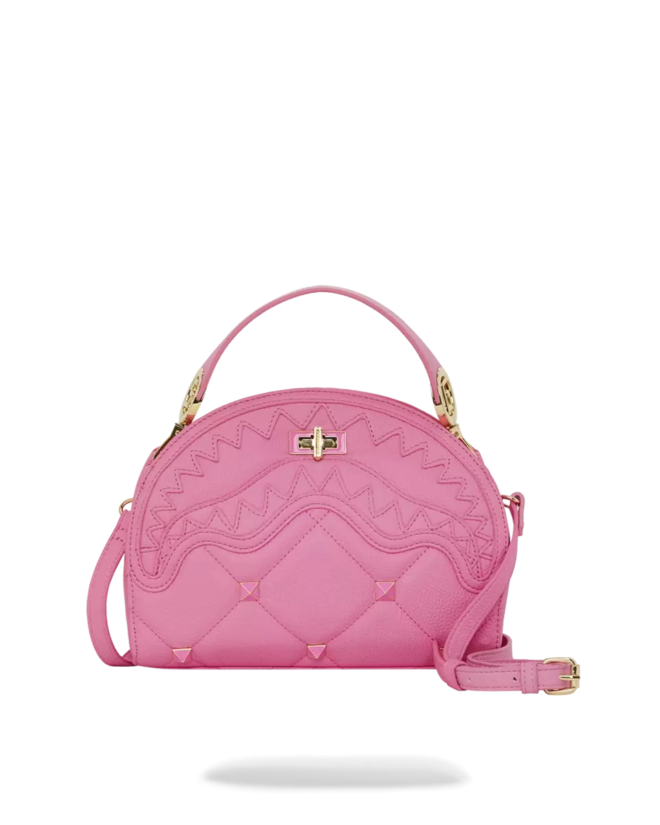 Quilted and embellished pink/ gold enamel studs & custom Sprayground logo hardware H10” x W6” x D2.5” Turn-lock closure Interior zipper pocket Can be worn handh