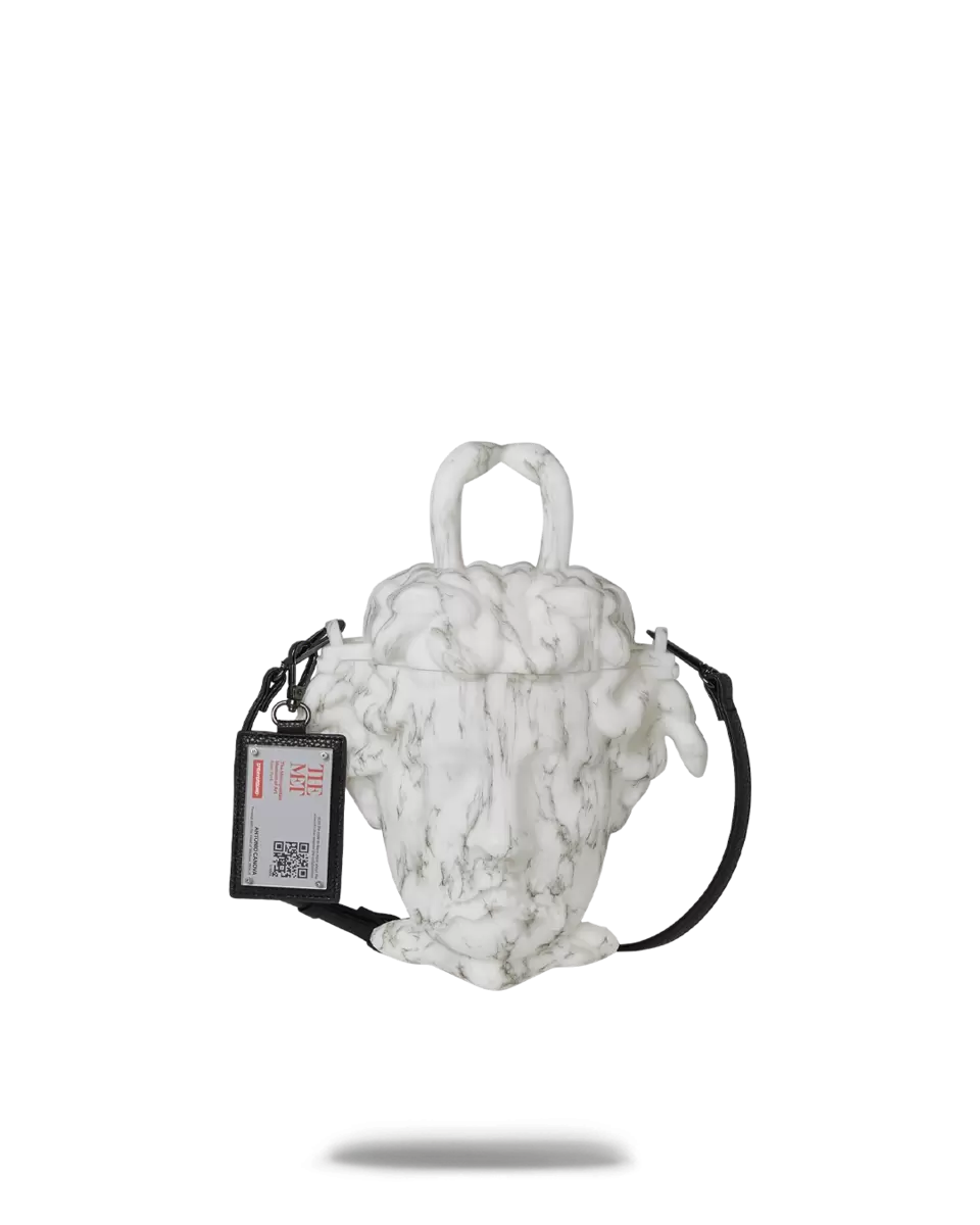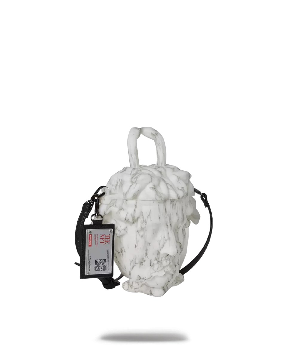 This head-turning handbag references Antonio Canova’s (Italian, 1757–1822) Perseus with the Head of Medusa (1804–6), a monumental sculpture in The Met collection. It celebrates the Greek hero Perseus’s victory over Medusa, the monstrous mythological Gorgon feared for her hair made of snakes and her deathly gaze that turned anyone she looked at to stone. Canova masterfully commemorates Perseus’s triumph over Medusa, whose likeness has long served as an image of evil to repel evil. The artist was universally acknowledged as the preeminent sculptor of his era, and his imposing masterwork in the Museum’s holdings closely reflects his admiration for the art of antiquity. This unique bag integrates a Sprayground element, our signature shark mouth.