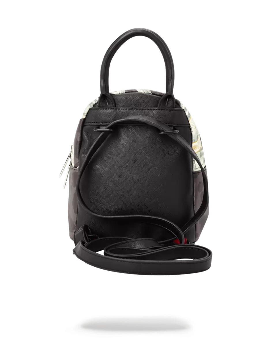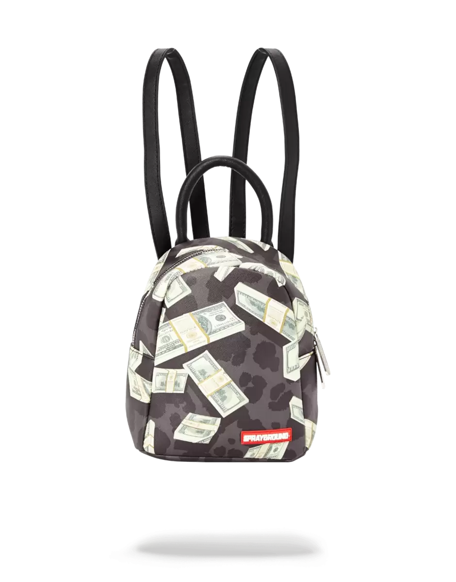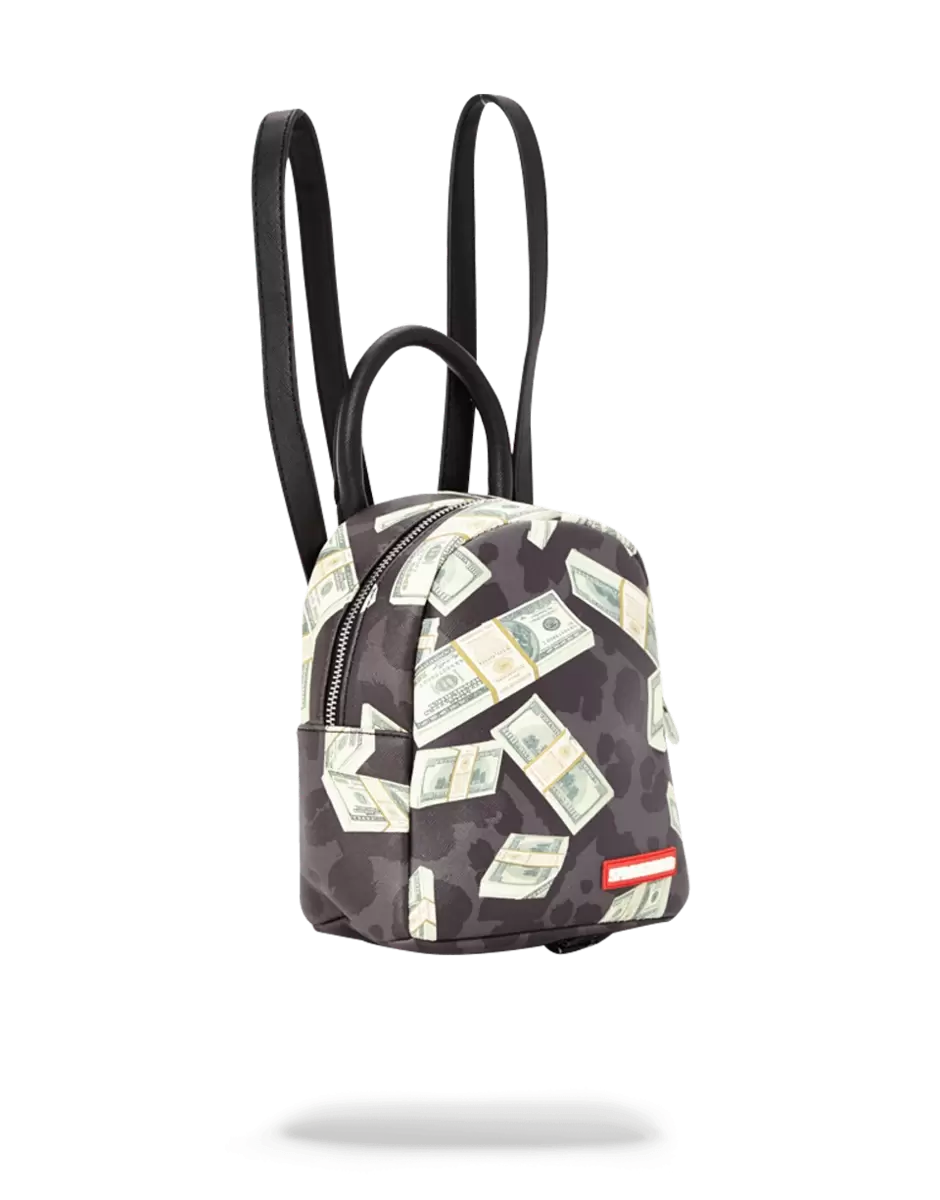 Small leatherette bag with thin straps with printed money on black leopard can be carried as a backpack or a hand bag