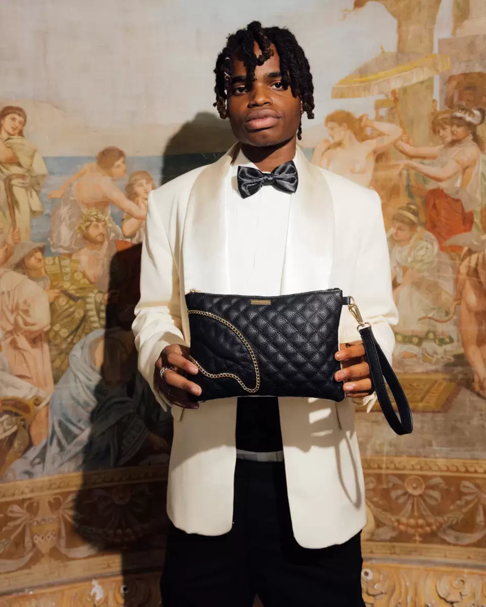 100% FAUX LEATHER Quilted in a double needle diamond Delicate gold chain applique details Gold metal hardware Convertible Clutch “Pouchette” Pouch with removabl