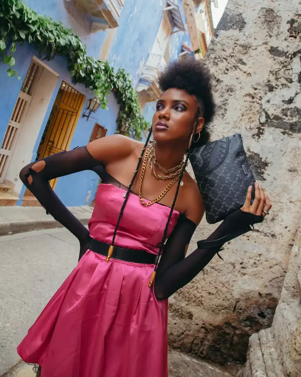 100% PVC with exclusive laser cut money logo pattern applied over metallic iridescent fabric to give a touch of shimmer to the fabric