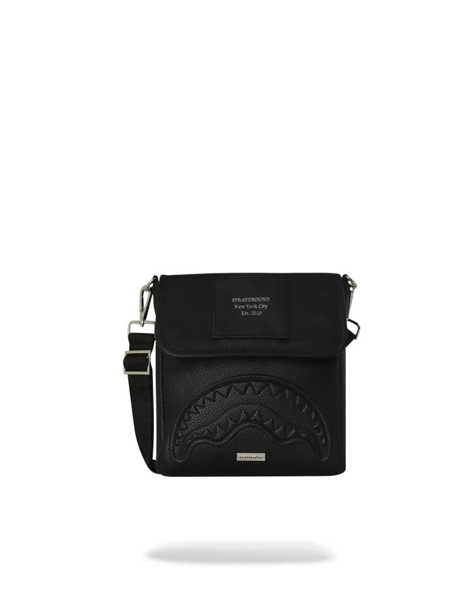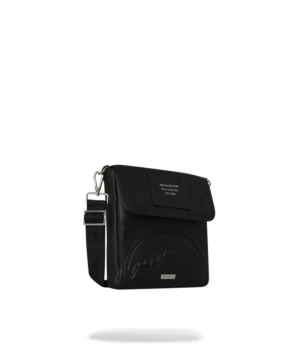 Cut and sew sharkmouth shape with embossed silver foil lettering